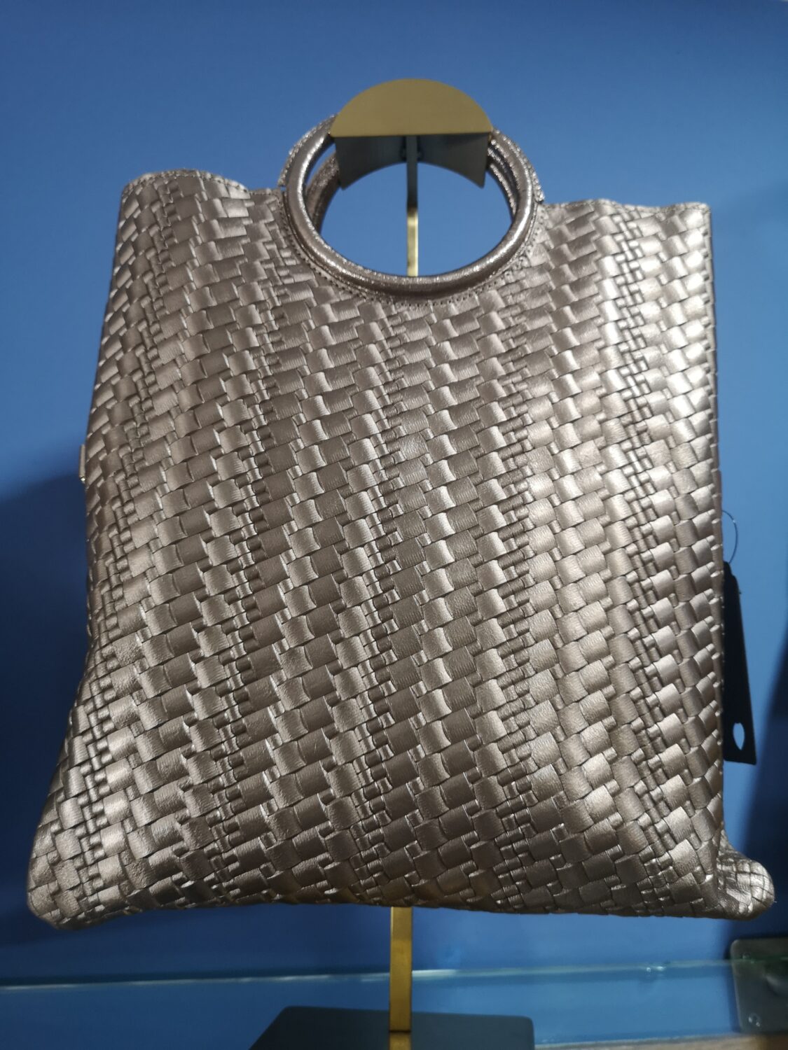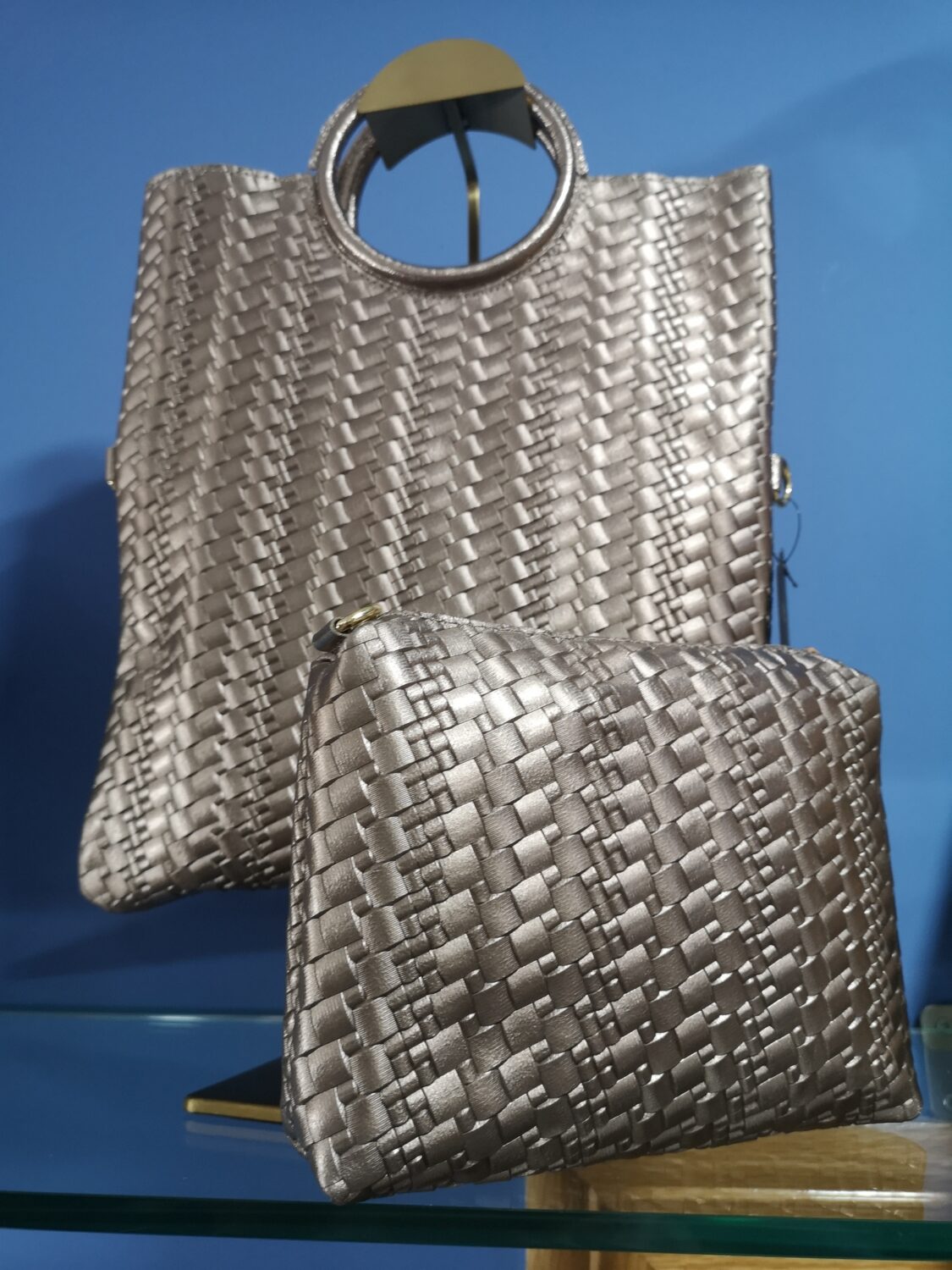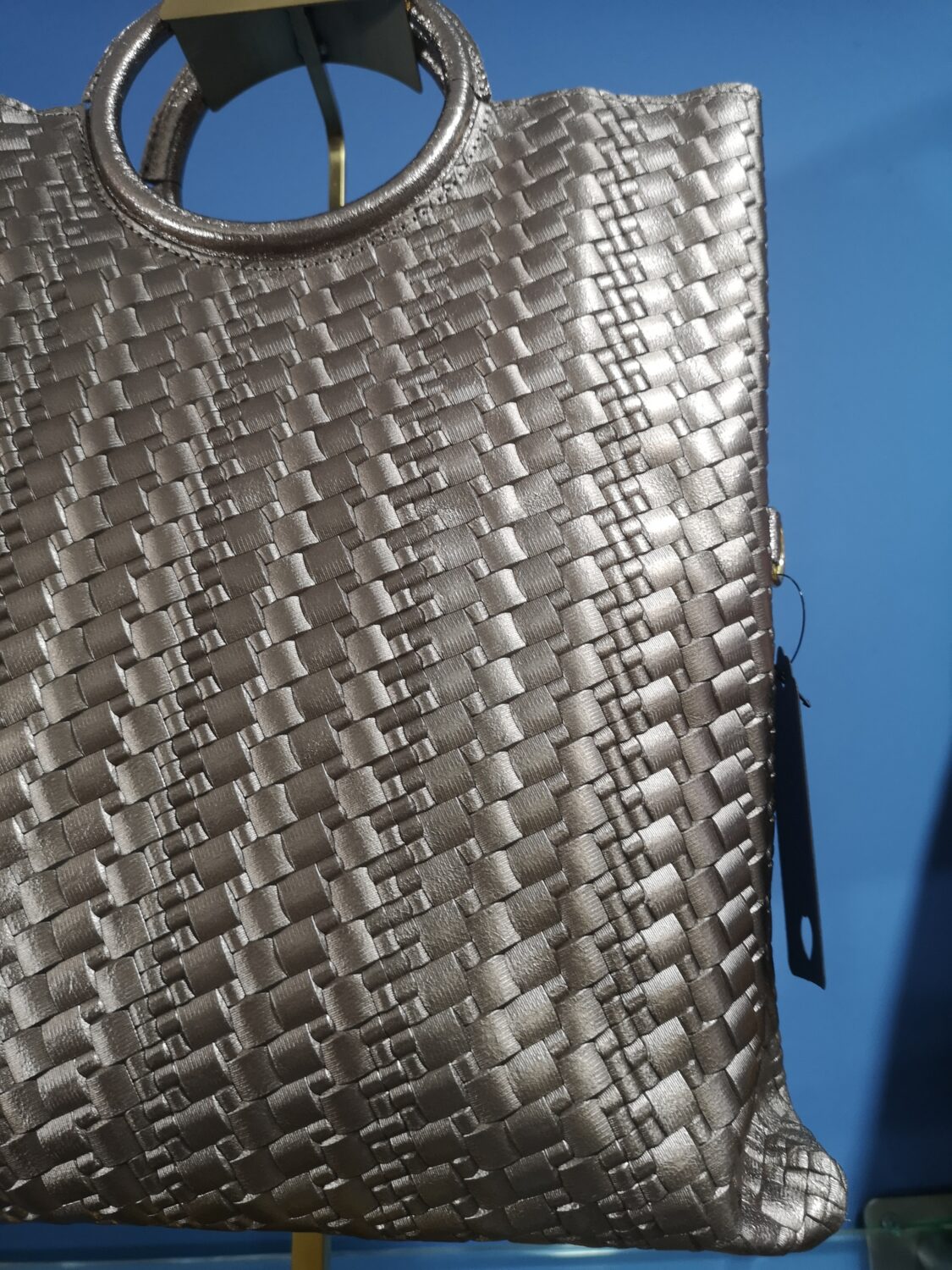 Bolso de piel. Estampado entrelazado. Lleva correa para colgar. Neceser interior para guardar cosas de valor.