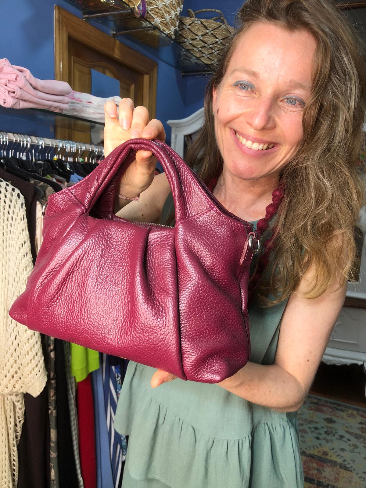 Color burdeos. De piel. Pinzas. Asa larga para quien lo quiera colgado.