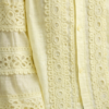 Es de color amarillo. Puntilla. Brocados. Manga bombacha tipo camisa corsaria. Mas larga por detrás. Por detrás es lisa.