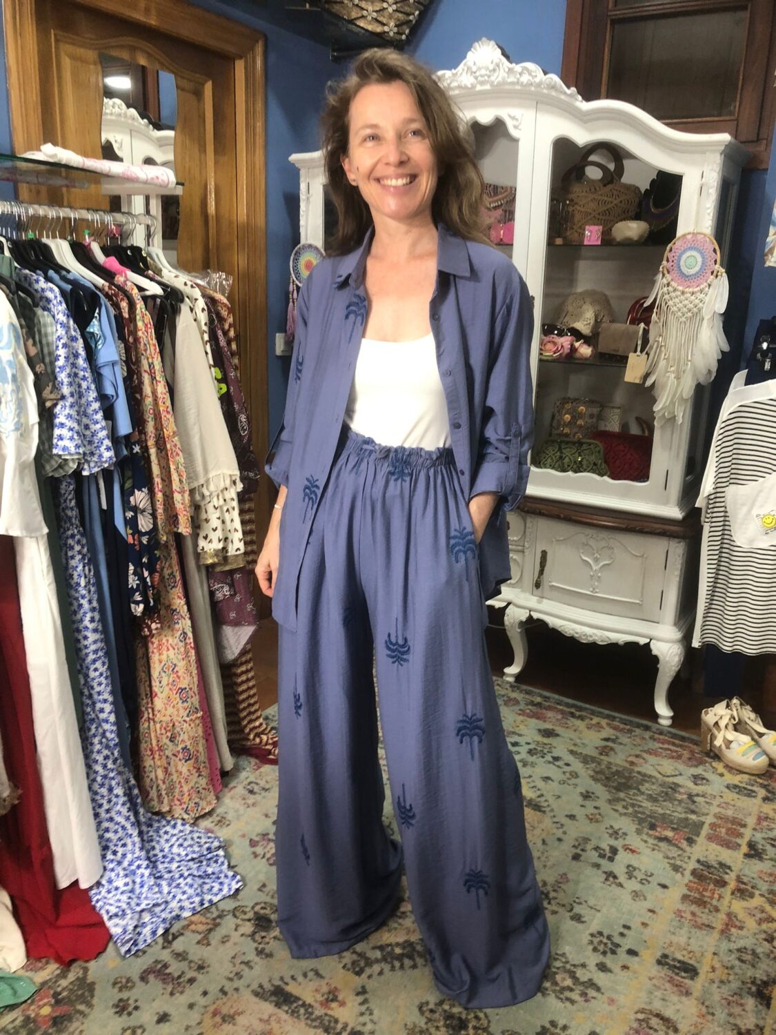 Fondo en color azul añil con palmeras bordadas a mano. Recoge mangas.