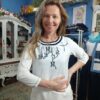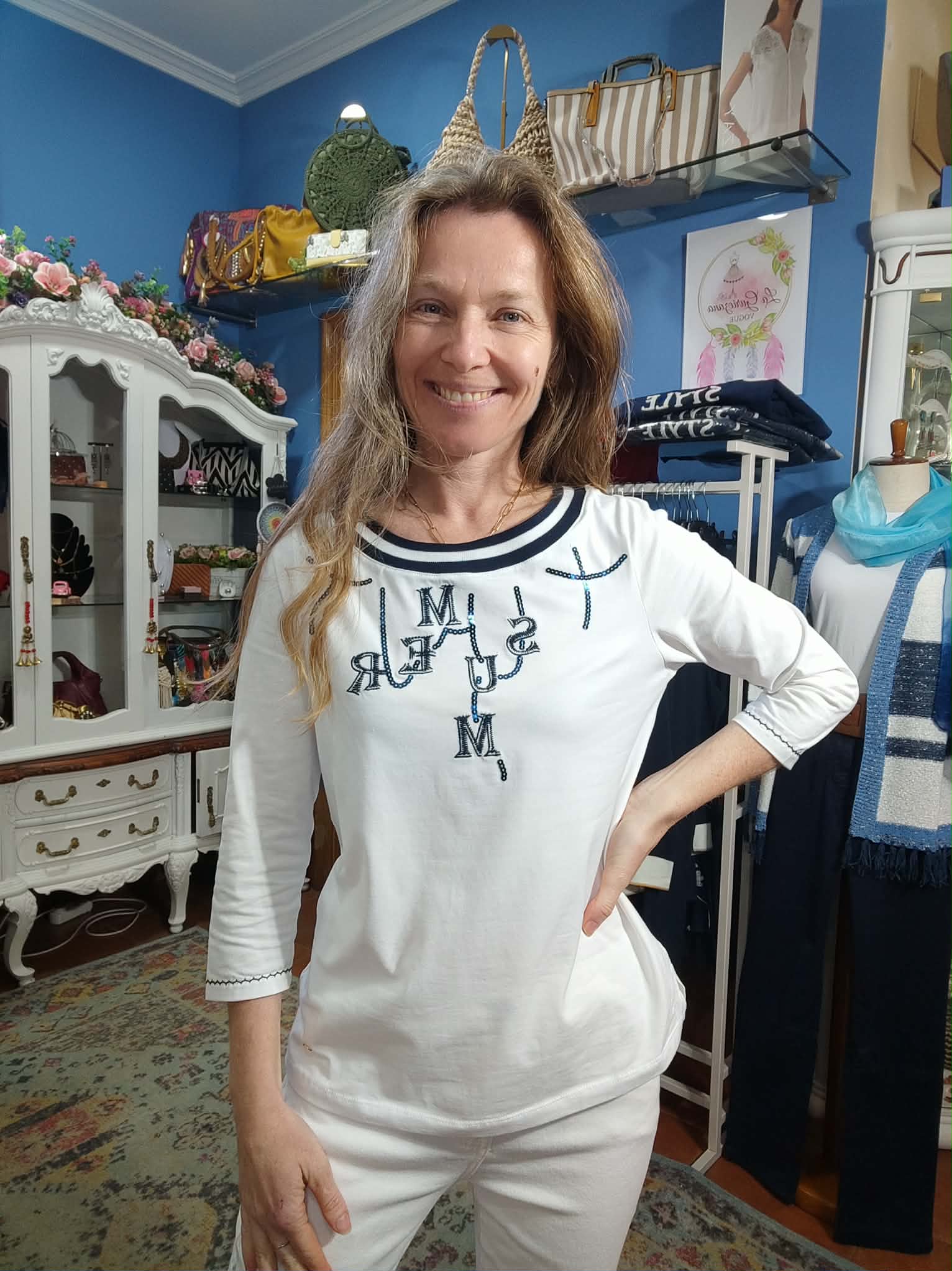 Manga francesa. Fondo blanco con rallas, letras y lentejuelas en azul marino. Letras y manga lleva un bordado. Aberturas laterales.