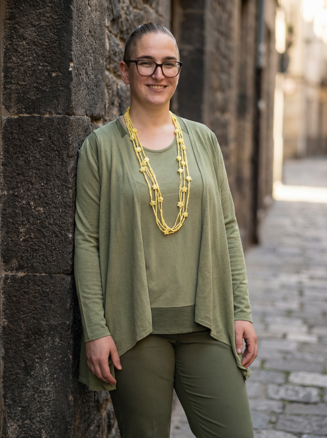 Tejido globo. No se arruga nada. En el bajo y en hombreras contraste en color verde como el pantalón. Manga francesa.