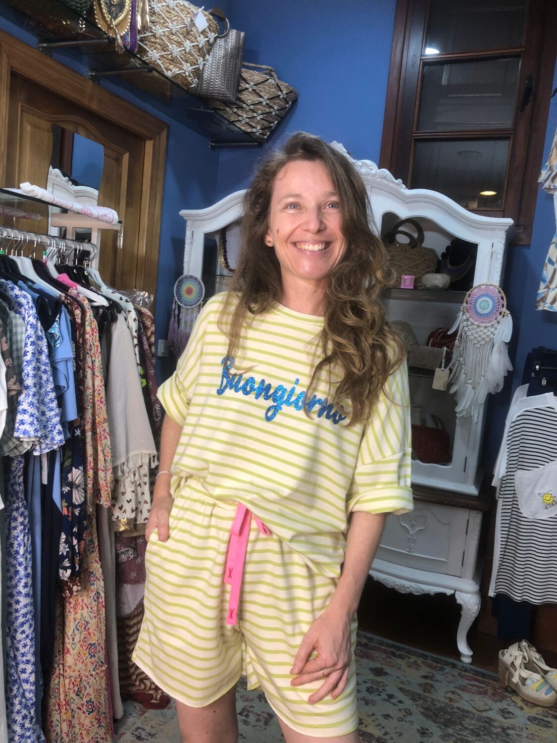 Camiseta: Letras en contrate azul brillo. Manga por debajo del codo.