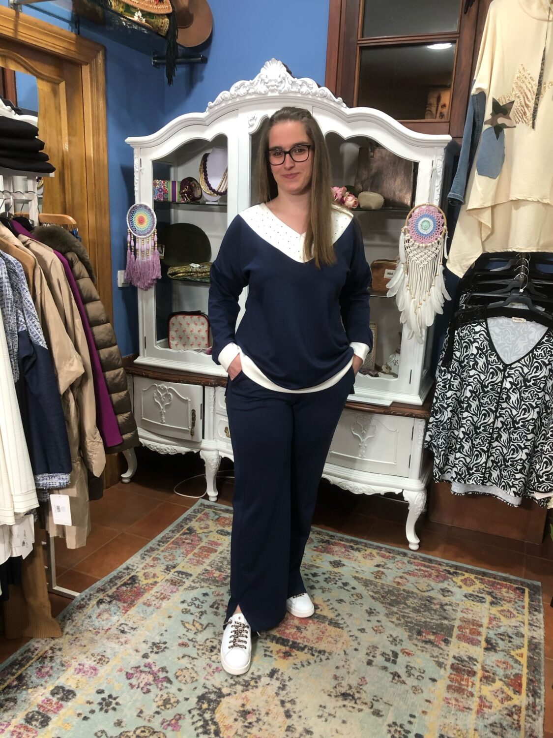 Tiro alto. Bolsillos. Goma en la cintura. Aberturas laterales. Detalle de una ralla por detrás que le da un toque diferente.